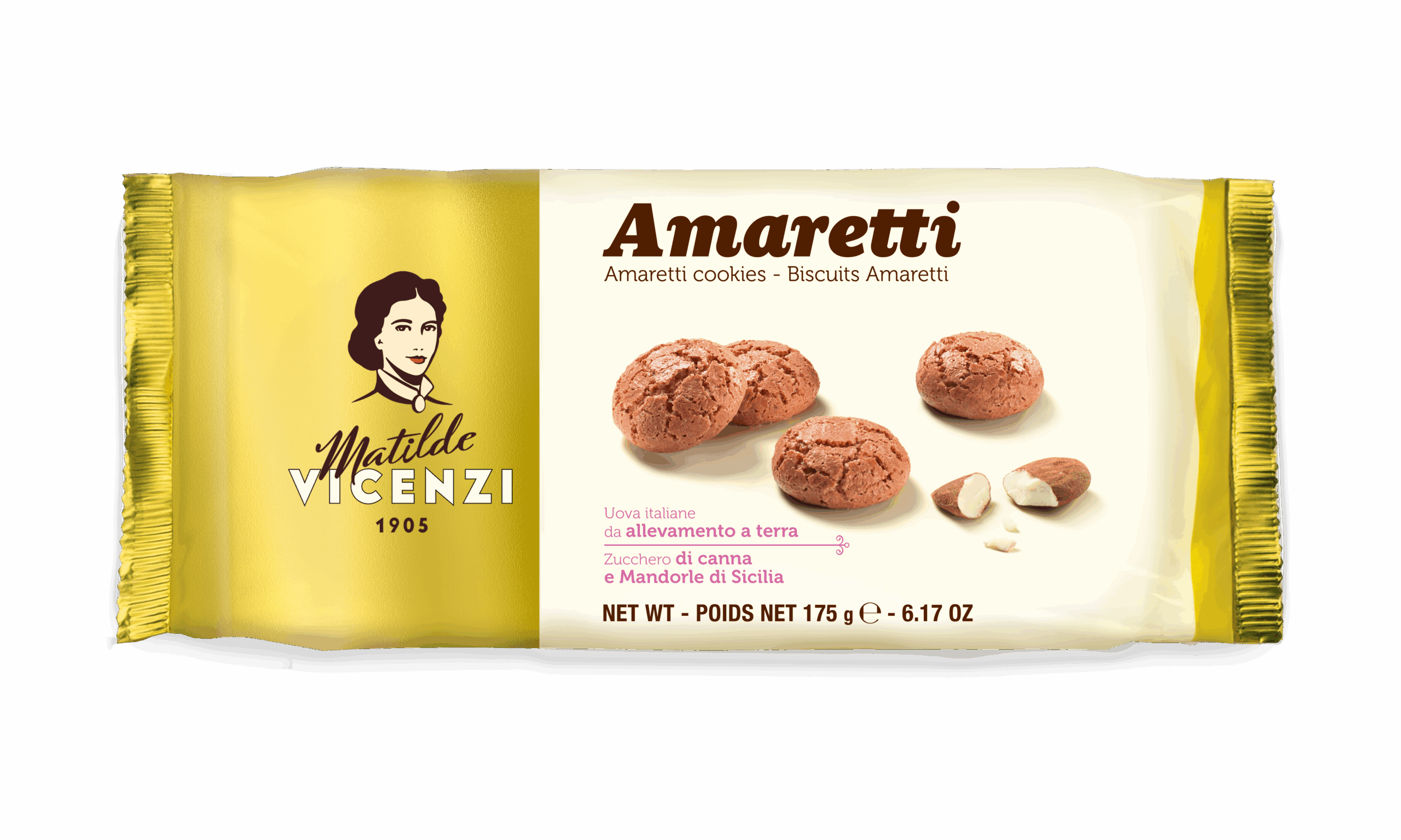 O Biscoito Amaretto da Vicenzi é um biscoito tradicional italiano, que é um clássico da linha Matilde Vicenzi. A atenção de Matilde Vicenzi a ingredientes de qualidade e a deliciosa arte fazem de Matilde Vicenzi amaretto o primeiro da Itália a obter a certificação do produto. Os ingredientes secretos do macaroon, com seu sabor único e especial, são os grãos de damasco que dão a massa, feita de açúcar e claras de ovos o sabor agridoce, conquistando até os paladares mais refinados. A fragrância e a delícia do Amaretto d Italia o tornam perfeito para o consumo como um lanche a qualquer hora do dia ou como um toque especial enquanto prepara as mais deliciosas receitas doces e salgadas.