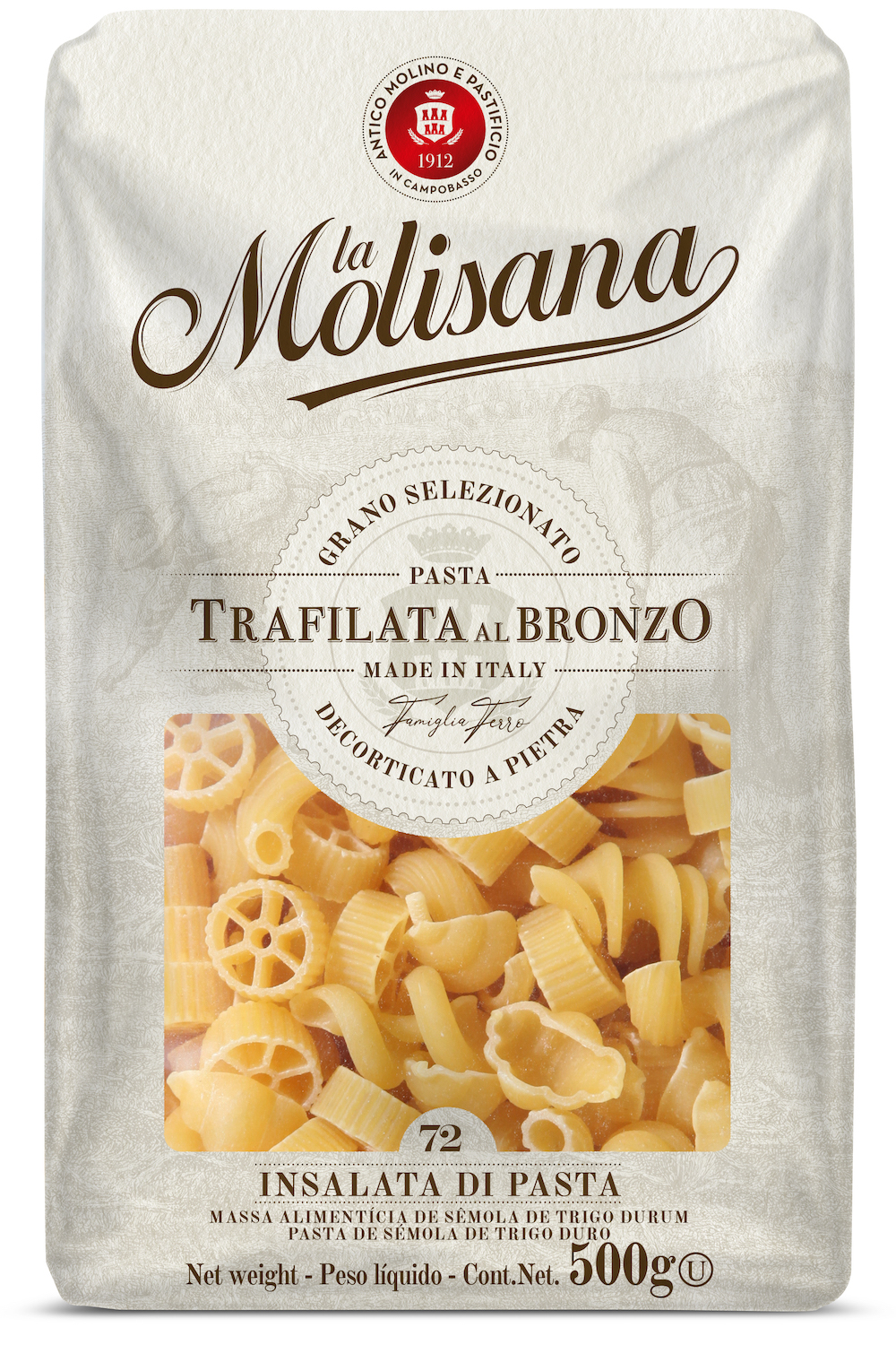 Massa super premium, trafilada em bronze, feita à partir de trigo de inverno que confere ao produto altíssimo teor de proteínas, obtendo como resultado a legítima massa al dente italiana.