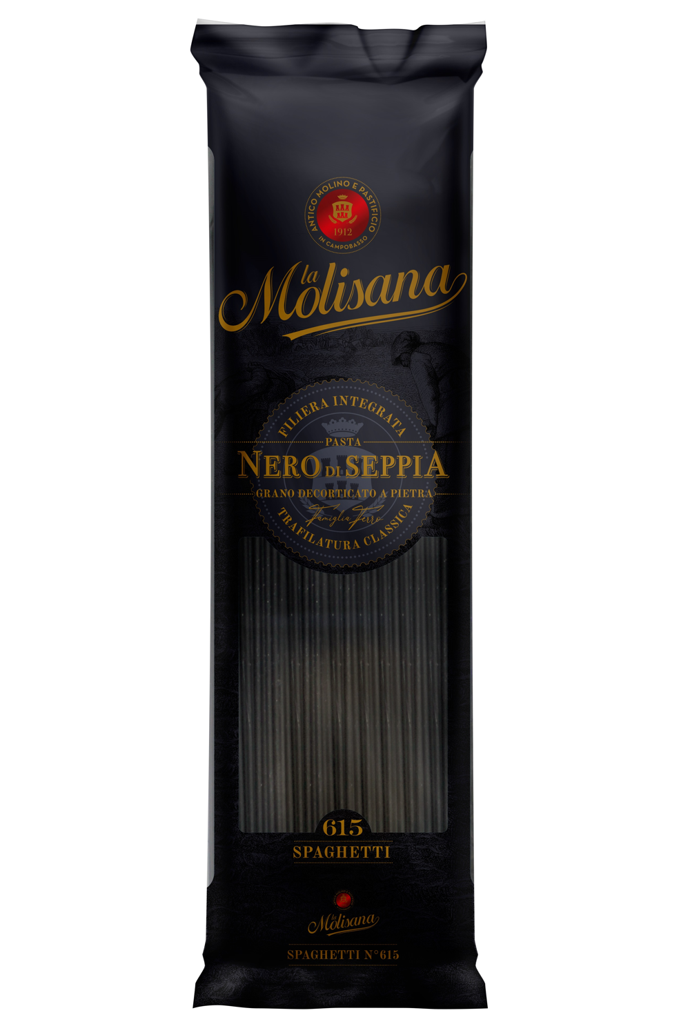 Massa adicionada a tinta de lula, super premium, trafilada em bronze, feita à partir de trigo de inverno que confere ao produto altíssimo teor de proteínas, obtendo como resultado a legítima massa al dente italiana.